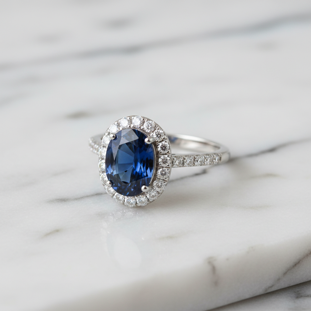 - Pedra: Safira natural de cor azul intensa, selecionada por sua transparência e brilho